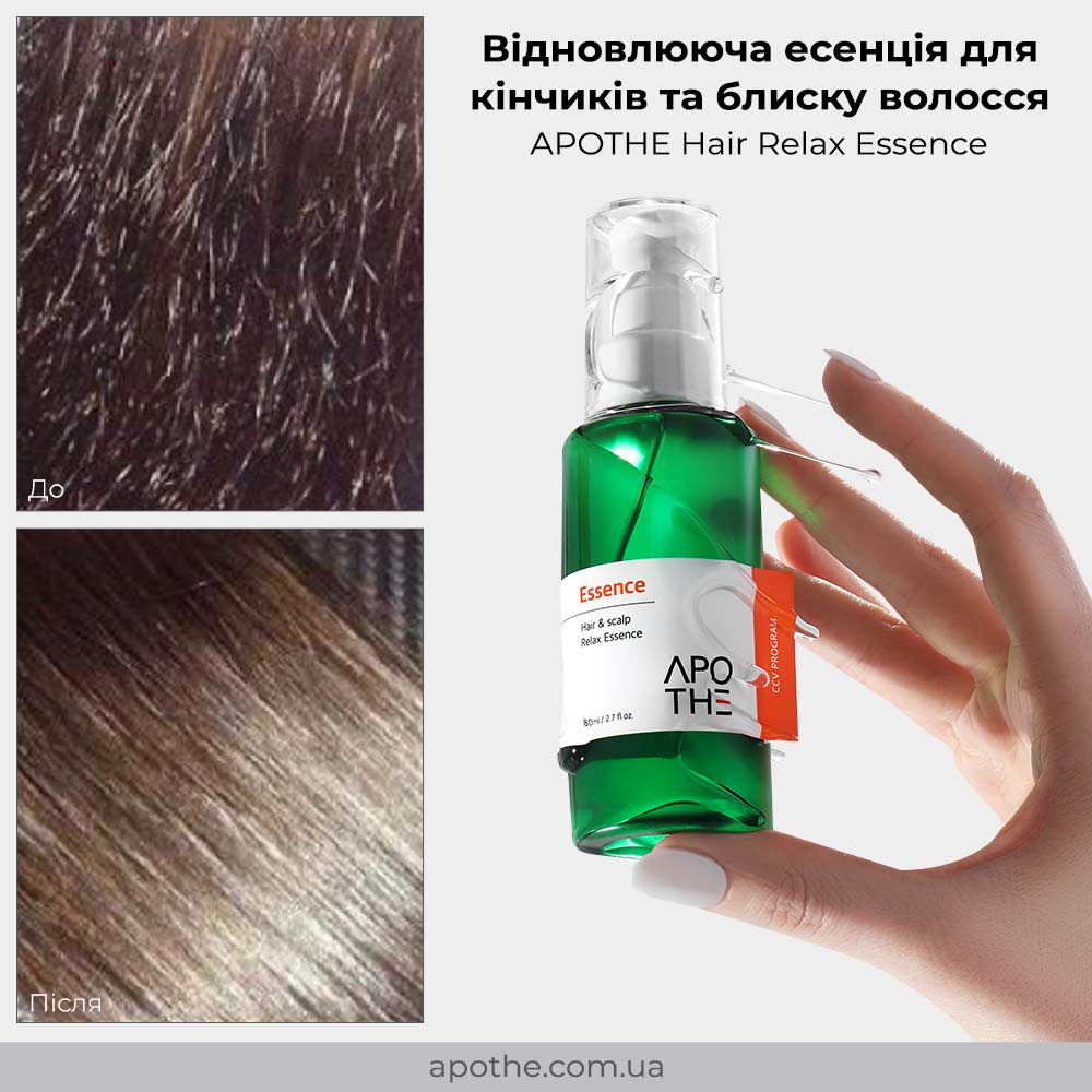 APOTHE Hair Relax Essence - це ваш вірний союзник у боротьбі за здорове і красиве волосся. Цей продукт не тільки відновлює пошкоджену структуру волосся, а й створює захисний бар'єр від негативних зовнішніх факторів. Регулярне використання есенції забезпечить вашим локонам силу, блиск і шовковистість.