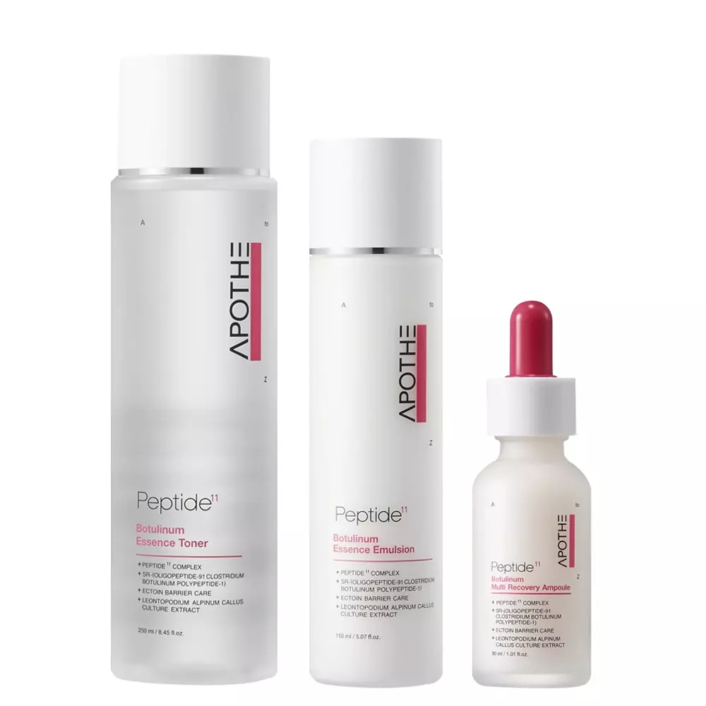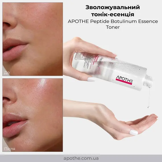 - Тоник-эссенция APOTHE Peptide Botulinum Essence Toner обеспечивает глубокое увлажнение, укрепляет защитный барьер и активизирует процессы восстановления кожи. Содержащийся в тонере уникальный комплекс из 11 пептидов, включая миорелаксирующий пептид-ботулин, эффективно уменьшает мимические морщины и способствует улучшению текстуры кожи.